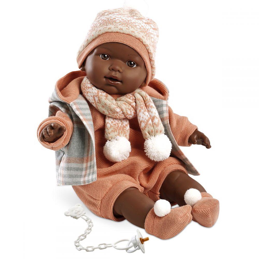 Nasza lalka wykonana jest z wysokiej jakości materiałów. Jej ciało zrobione jest z przyjemnego w dotyku winylu a brzuszek wypełniony miękką wyściółką. Po wyjęciu smoczka lalka zapłacze i zawoła: mama, papa! Główkę naszej lali zdobi pomarańczowo-beżowa czapeczka z pomponem. Zareb ubrany jest w pomarańczowy kostium, ciepłą szaro-pomarańczową bluzę z kapturem oraz skarpetki z pomponem pasujące do kompletu.Lalka zapakowana jest w kartonowe pudełko, idealne na prezent.