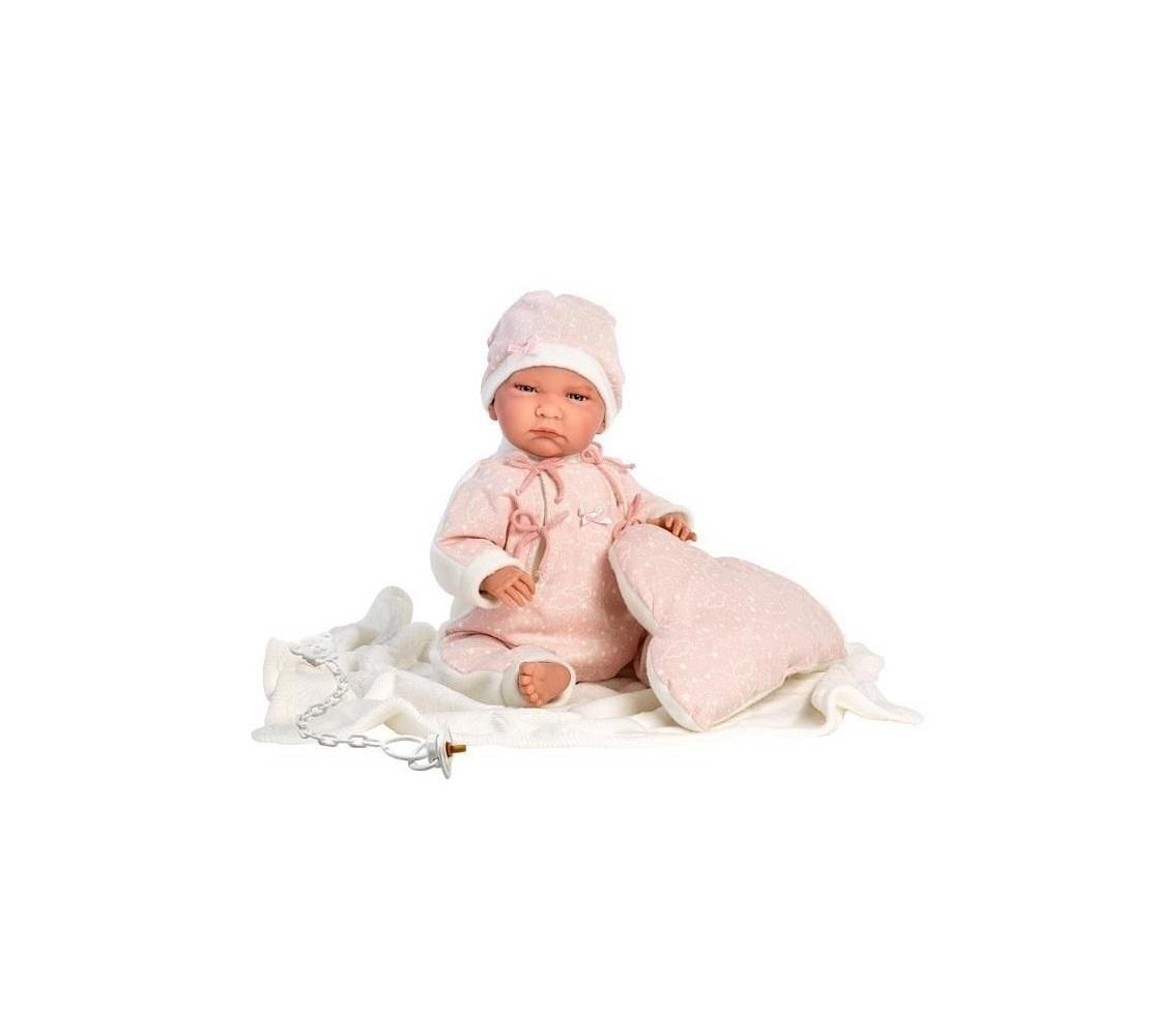 Lalka płacząca Mimo 42 cm została wyprodukowana przez hiszpańska markę Llorens. Jest to uroczy chłopiec o niezwykłym podobieństwie do prawdziwego dziecka w wieku niemowlęcym. Mimo bardzo lubi swój smoczek więc gdy mu go zabierzemy będzie płakał i wołał mama, papa. Ciało lalki zostało wykonane z przyjemnego w dotyku winylu a brzuszek z materiału, wypełniony miękką wyściółką. Chłopiec został ubrany w błękitny pajacyk i czapeczkę. Do zestawu dołączono biały kocyk oraz pasującą do stylizacji lalki poduszkę-chmurkę. Lalka została zapakowana w ozdobny karton. Załączony smoczek pełni funkcję dekoracyjną. Kochamy hiszpańskie lalki Llorens!