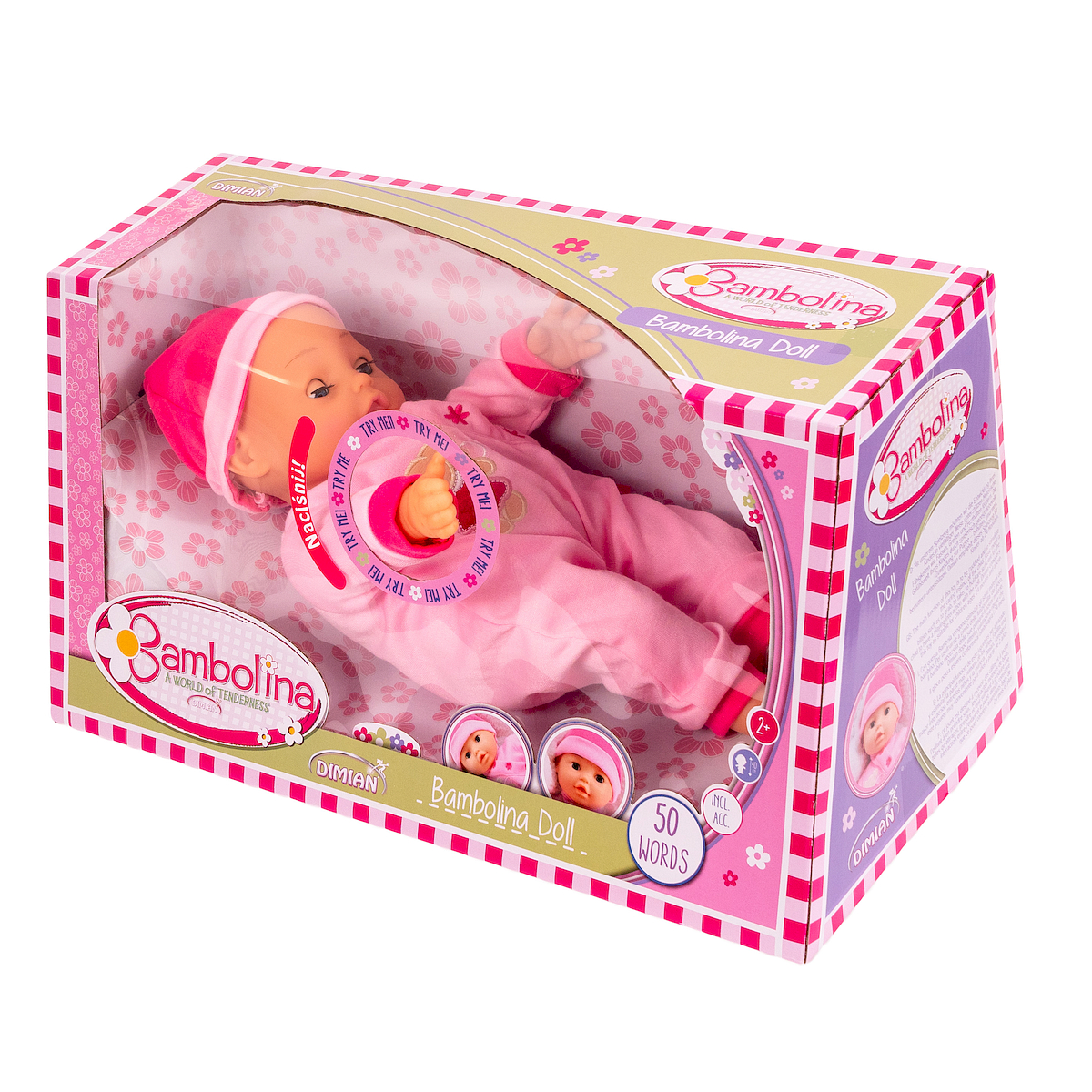 Bambolina to piękna lalka. Naciśnij jej brzuch, a wyda różne dźwięki. Rozmiar lalki 40 cm. x