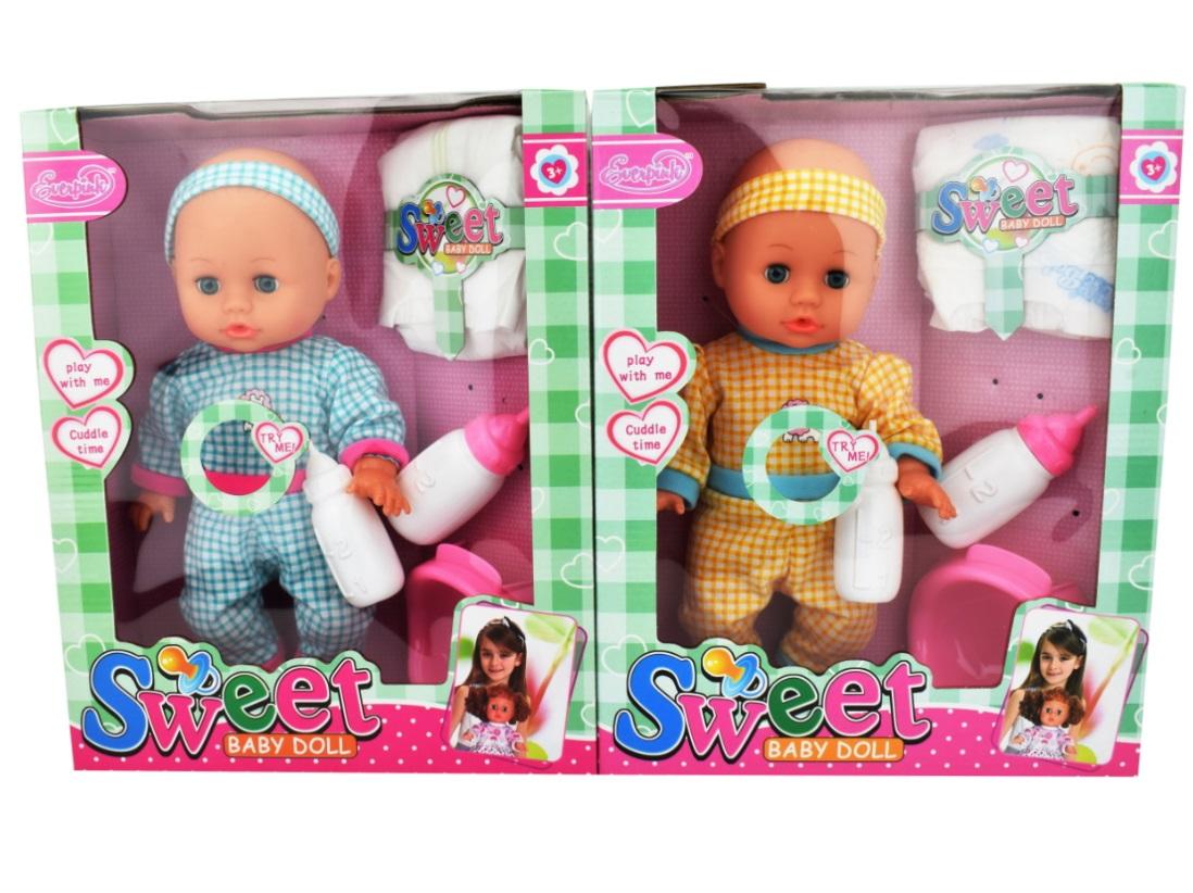 Zabawka dla dziewczynek lubiących lalki. Akcesoria buteleczka z płynem i pampersy pozwalają naśladować mamę, lub dziecko, które opiekuję się młodszym rodzeństwem. Lalka na baterie wydaje dźwięki: mama, realistycznego płaczu, tata, śmiechu, 2 frazy gaworzenia (wczesnej mowy dzieci naśladujących rozmowę). W zestawie pielucha i nocnik. Jak lalka wypije napój (wodę) będzie siusiała. x