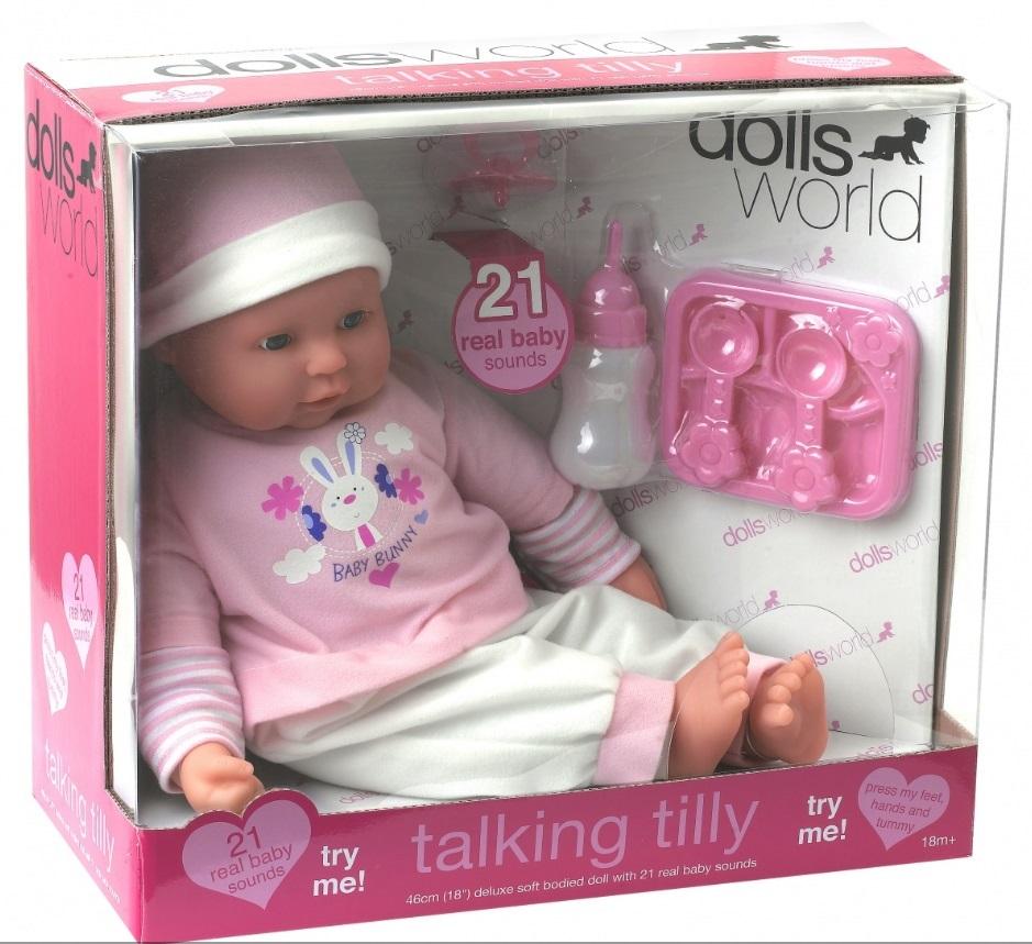 Wysokiej jakości lalka o długości 46 cm. Wykonane z atestowanego, miłego w dotyku tworzywa główka, rączki, nóżki oraz szmaciany korpus po naciśnięciu wydają aż 21 dziecięcych odgłosów. Lalka jest miękka, dzięki czemu można ją przytulać, kłaść, sadzać w dowolnej pozycji, tak jak prawdziwe dziecko. Tilly ma oczka, które się zamykają gdy leży i może ssać palec lub smoczek, który dołączony jest do zestawu.