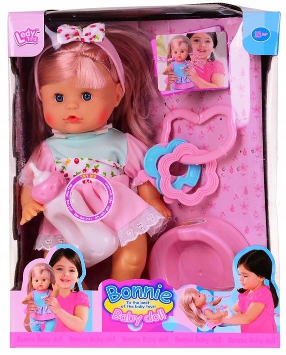 Lalka Bonnie z funkcją picia i siusiania. W komplecie z butelką i nocniczkiem.