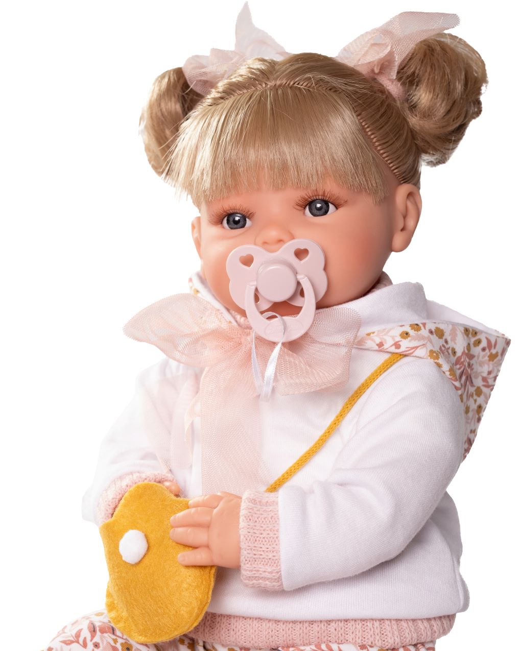 Opis produktuZasady bezpieczeństwaLalka hiszpańska płacząca Beni z torebką 42 cm Antonio Juan 16384 Jeśli mała wielbicielka wyjątkowych zabawek marzy o hiszpańskiej lali przyjaciółce, idealnej do przytulania, przebierania i czesania, blondynka o imieniu Beni z pewnością wzbudzi zachwyt. Model 16384 z miękkim brzuszkiem, od renomowanego producenta Antonio Juan ma 42 cm wysokości i przypomina małą dziewczynkę. Po wyjęciu smoczka płacze i mówi: mama, papa. Stale otwarte, brązowe oczy o głębokim spojrzeniu opatrzone są długimi rzęsami i delikatnie namalowanymi brwiami. Lalka hiszpańska Antonio Juan Beni 16384 w modnym stroju Wykonana z wysokiej jakości, przyjemnego w dotyku winylu lalka hiszpańska Antonio Juan 16384 posiada materiałowy brzuszek wypełniony miękką wyściółką. Beni ubrana jest w oryginalny, szyty ręcznie strój, który można zdjąć: jasny ciepła bluza z kapturem i tiulową kokardą ładnie prezentuje się w komplecie z bawełnianymi długimi spodenkami w roślinny wzór, zestaw uzupełnia specjalny smoczek magnetyczny na tasiemce oraz mała żółta torebka dla lalki. Atonio Juan Beni to unikalna lalka hiszpańska na prezent Lalka Beni 42 cm posiada wszystkie wymagane certyfikaty bezpieczeństwa. Jest przeznaczona dla dzieci od 3 roku życia. Wyprodukowana została w całości w Hiszpanii. Zapakowana w biało-różowe, ozdobne pudełko z wieczkiem, świetnie sprawdzi się jako oryginalny prezent dla wielbicielki wyjątkowych zabawek. x