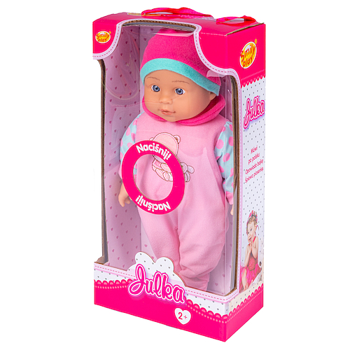 Lalka Julka lubi, kiedy się nią opiekujesz i zabierasz ze sobą na spacery. Miękka lalka jest ubrana w czapkę, kombinezon z różnych faktur materiałów. Lalka, po naciśnięciu na brzuszek: Mówi po polsku pełnymi zdaniami Śpiewa piosenkę Opowiada bajkę o Złotowłosej i 3 misiach Podczas zabawy lalkami, zachodzą silne procesy sensoryczne, które są niezbędne do prawidłowego rozwoju dziecka. Dziecko, podczas zabawy lalką odbiera w mózgu sygnały, które następnie przetwarza i odpowiada, odpowiednio reagując. Lalki to nierozłączny element dzieciństwa. Zachęcają do aktywnej oraz kreatywnej zabawy, dają również możliwość stworzenia własnego świata. Dzięki nim uczymy się opiekuńczości oraz wrażliwości. Z lalką dziecku łatwiej jest wkroczyć w świat radości, strachu, euforii i smutku. Noszenie, kołysanie, przytulanie lalki przynosi wiele pozytywnych emocji i pozwala na harmonijny rozwój. Poprzez zabawę pobudza rozwój systemów sensorycznych. Wysokość lalki 32 cm x