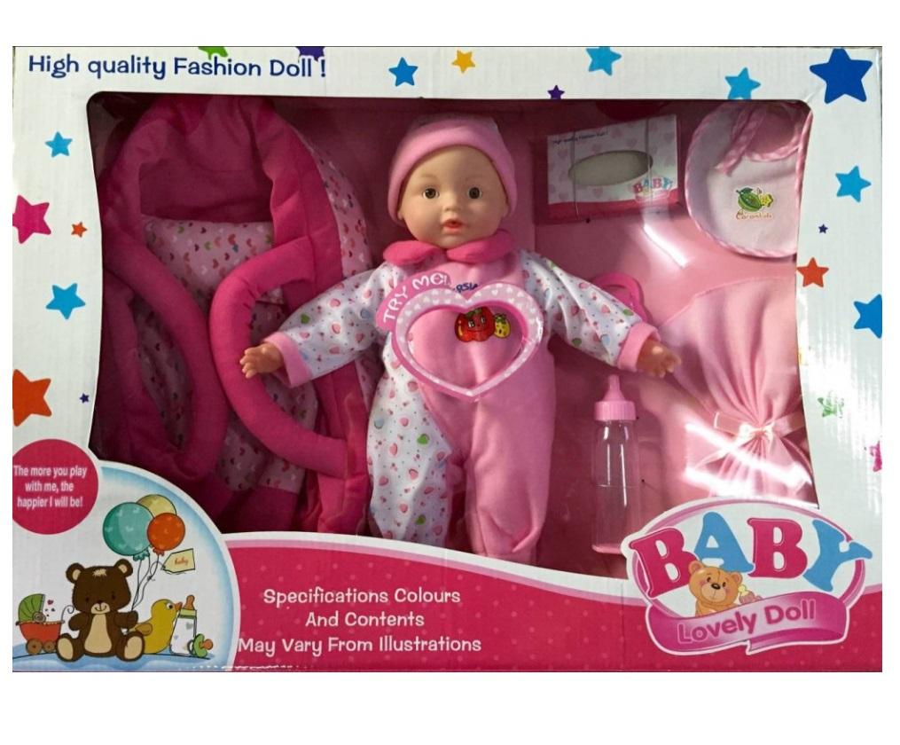 Lalka niemowle z nosidełkiem i innymi akcesoriami do zabawy.