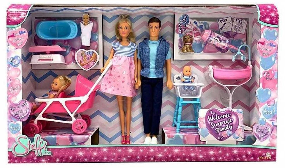 Opis produktuZasady bezpieczeństwaSteffi Rodzina z trojaczkami Lalka Steffi jest w ciąży, jest już mamą dwójki dzieciaczków i oczekuje trzeciego bobaska, czy będzie to chłopiec czy dziewczynka? - to zdradzi dołączona tuba z konfetti, które są w kolorze niebieskim lub różowym.Dołączone liczne akcesoria do pielęgnacji dzieci min.: wanienka, waga, kołyska, krzesło do karmienia, wózek dla bliźniąt. Wysokość lalek: Kevin 30cm, Steffi 29 cm, Evi 12cm, bobas 7cm, bobas w brzuchu: 4cm. Wiek: +3 x