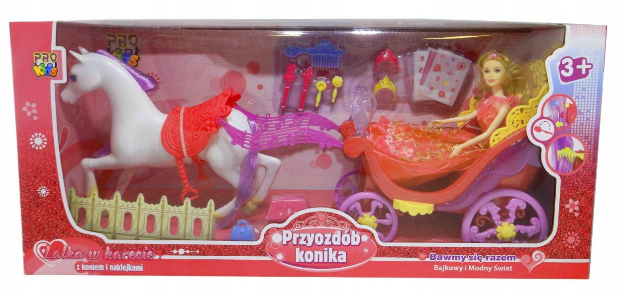 Lalka z koniem i karetą na baterie. Jeździ i wydaje dźwięki. Konik do dekorowania zestaw z naklejkami, wiele dodatków dla lalki oraz konika. Konika można nie tylko przyozdabiać naklejkami dołączony do zestawu ale i udekorować jego włosy.