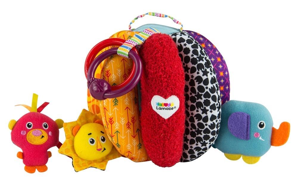 Pluszowa piłkaz grzechotką i gryzakiem. Dzięki wykonaniu z materiałów o różnej fakturze, w jaskrawych kolorach oraz szeleszczącym elementom stymuluje dotyk, wzrok i słuch.