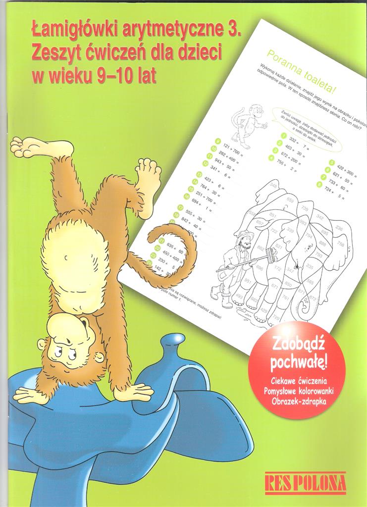 Zeszyty z serii Łamigłówki arytmetyczne są przeznaczone dla wszystkich uczniów, niezależnie od tego, z jakich podręczników korzystają. Zaproponowane w nich ćwiczenia mogą być wykorzystane jako rozrywka w domu, urozmaicenie zajęć szkolnych lub pomoc w pracy wyrównawczej z uczniem.Małpka Fiki towarzyszy dziecku na wielu stronach zeszytu i udziela mu pomocnych wskazówek. Dziecko może samodzielnie decydować o tym, na ilu stronach rozwiąże jednorazowo wszystkie zadania. Kolorowanku pozwalają na samodzielne sprawdzenie wykonanych zadań.Dodatkowo po opracowaniu większej partii materiału umieszczono sprawdzian nabytch umiejętności.Na początku zeszytu uczeń znajdzie obrazek, a na nim pola zdrapki z ukrytymi obrazkami i numerem obok, które będą nagrodą za rozwiązanie zadań na każdej stronie, co motywuje dziecko do dalszej pracy. Kiedy zostaną rozwiązane wszystkie zadania z zeszytu ćwiczeń, dziecko zobaczy kolorowy, wspaniały obrazek.Na stronach 35-36 rodzice znajdą wskazówki, dzięki którym będą mogli wesprzeć dziecko przy pracy. Na stronach 32, 33, 34 zamieszczono odpowiedzi (wyniki poszczególnych obliczeń), które ułatwią szybkie sprawdzenie poprawności rozwiązanych ćwiczeń. Dodatkowo umożliwią one dziecku samokontrolę.Zeszyt ćwiczeń Łamigłówki arytmetyczne 3 został przygotowany dla dzieci w wieku 9-10 lat i zawiera ćwiczenia w rachunku pamięciowym na dodawanie, odejmowanie, mnożenie i dzielenie w zakresie 1000.