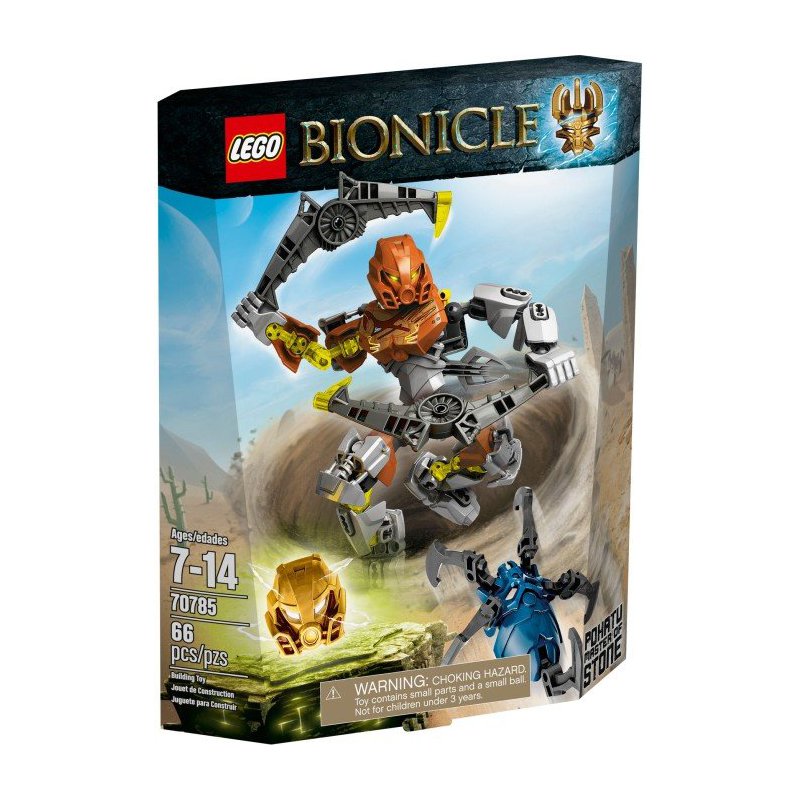 Przywołaj niezwykłą moc żywiołów Pohatu – władcy skał, aby pozbyć się Pająka Zgłady! Przyczep wielofunkcyjne rakietowe bumerangi do stóp tej potężnej figurki BIONICLE® o ruchomych kończynach i wystrzel prosto w niebo. Gdy znajdziesz Pająka Zagłady, zmień rakietowe bumerangi w 2 ogromne bumerangi bojowe i przygotuj się do walki o Złotą Maskę Skał. Nie pozwól, by wróg zdjął maskę Pohatu i włącz ramię bojowe, którego potworna siła wyrzuci Pająka Zagłady w powietrze!