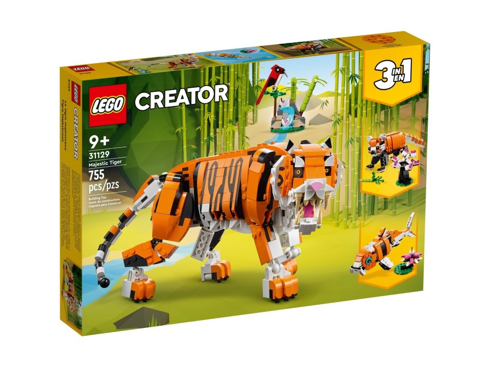 o Trzy modele zwierząt w jednym zestawie -- fani LEGO(R) mogą przeżywać nieograniczone przygody z zestawem Majestatyczny tygrys (31129), który pozwala zbudować tygrysa, pandę czerwoną lub karpia koi
