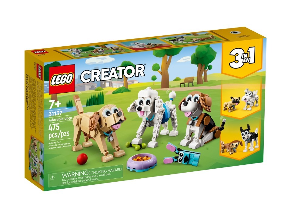Opis produktuZasady bezpieczeństwaMiłośnicy psów i dzieci w wieku od siedmiu lat mogą bawić się uroczymi pieskami z zestawu LEGO(R) Creator 3 w 1 Urocze psiaki (31137). Zawiera on beagle'a, pudla i labradora z ruchomymi głowami, ogonkami i uszami, a także akcesoria, w tym miskę, szczotkę, zabawkowego królika, piłkę i smycz, aby urozmaicić wymyślane przez dzieci historie. Prezent dla wielbicieli psów Aplikacja LEGO Builder