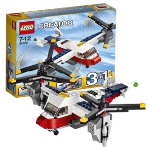 Ten dwuwirnikowy samolot jest naprawdę rewolucyjny! Rozkręć śmigła i wystartuj jak helikopter. Potem obróć silniki o 90 stopni i ruszaj naprzód jako samolot, utrzymując równowagę dzięki dwóm tylnym stabilizatorom. Czerwono-białe barwy i efektowne rury wydechowe sprawiają, że nikt nie przegapi go na niebie. Na ziemi możesz się dostać do ładowni po rampie.