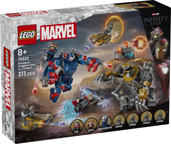 LEGO(R) ǀ Marvel Avengers: Koniec gry Thor kontra Chitauri (76322) to wysokiej jakości zabawka z superbohaterami. Ten wszechstronny zestaw będzie świetnym prezentem dla dzieci w wieku od ośmiu lat, które lubią filmy Marvela, mechy, bohaterów i film Avengers: Koniec gry Wzorowany na kultowej scenie bitwy z Avengersami Marvela zestaw zawiera dwie duże figurki LEGO: mecha Iron Patriota, który zawiera cztery miotacze klocków, i straszliwego goryla Chitauri. Obie są ruchome, co umożliwia dynamiczną zabawę. W zestawie jest też siedem minifigurek: Iron Patriot MK2, Rocket z dużym miotaczem klocków, Thor ze Stormbreakerem i czterech Chitauri (dwóch ma złote miotacze klocków). Inne funkcje obejmują dwa skutery odrzutowe i małą przestrzeń dla Thora, w której można przechowywać zapasowe elementy do miotacza. Ten zestaw można połączyć z zestawem Avengers: Koniec gry -- ostateczna bitwa (76323), co zapewnia dodatkowe możliwości zabawy. Konstruktorzy mogą również powiększać i obracać modele w 3D za pomocą fajnej, intuicyjnej aplikacji LEGO Builder. Zestaw zawiera 373 elementy. x