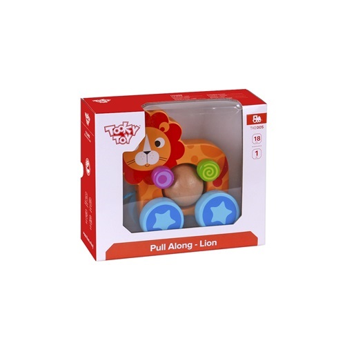 Drewniany Lew ma kółka i sznureczek do ciągnięcia. Dziecko, które opanowało zdolność samodzielnego chodzenia może zabrać Lwa na spacer.