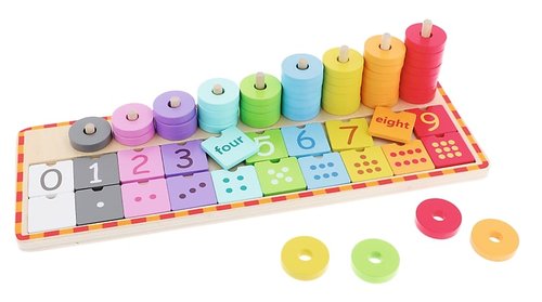 Doskonałe rozwiązanie dla dzieci już od 12 miesiąca życia. Zabawka uczy nowych umiejętności na różnych etapach rozwoju dziecka-najmłodsi rozwijają zdolności motoryczne oraz zręczność, starsze dzieci poznają kolory i uczą się liczyć. W zestawie: 45 kolorowych krążków, 10 żetonów z cyframi, 10 żetonów z rysunkami. Wszystkie materiały wykorzystane do stworzenia zabawki posiadają atesty, a także zostały pomalowane nietoksycznymi farbami. Wymiary opakowania: 43,5 x 11,0 x 15,2 cm x
