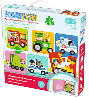 Połóweczki to pierwsze układanki dla najmłodszych. Dzięki zawartym w książeczce historyjkom maluchy poznają różne pojazdy i zawody z nimi związane. Dopasowywanie dużych 2-elementowych puzzli będzie stanowiło świetną zabawę po zakończeniu wspólnego czytania.