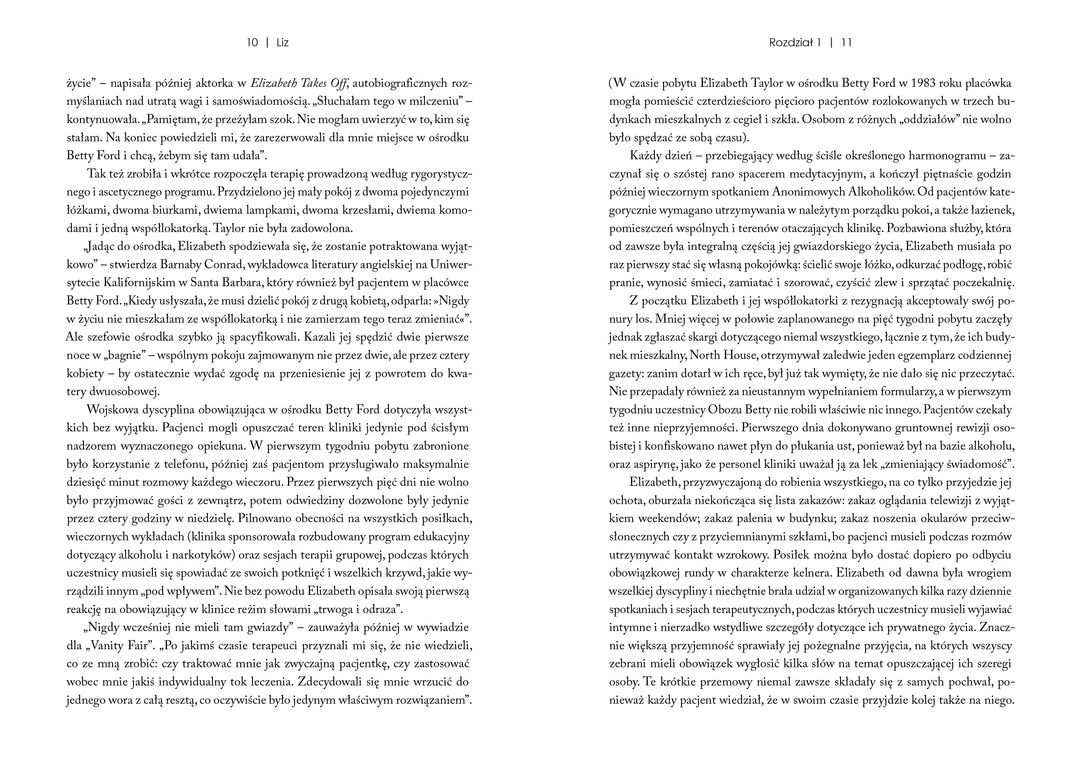 Opis produktuZasady bezpieczeństwaPrzez całe swoje życie Elizabeth Taylor w olśniewający i ekstrawagancki sposób grała jedną wybitną rolę: siebie, ostatnią wielką gwiazdę Hollywood. "Ona ma wszystko: czar, pieniądze, piękno, inteligencję. Dlaczego nie umie być szczęśliwa?" Andy Warhol Jedna z najczęściej fotografowanych kobiet świata, ikona stylu i obiekt niezliczonych plotek. Jej życie było dużo bardziej dramatyczne od ekranowych ról. Opresyjna matka była gotowa zrobić z niej gwiazdę za wszelką cenę - Taylor miała jedenaście lat, gdy podbiła świat rolą w Lassie, wróć! Ślub z dziedzicem hotelowej fortuny Hiltonów wzięła jako osiemnastolatka. Rok później była już po pierwszym rozwodzie. "Kiedy kogoś kocham, to kocham na sto procent". Za mąż wychodziła osiem razy - w tym dwukrotnie za Richarda Burtona, miłość swojego życia. Miała tyle romansów, że nawet Watykan oficjalnie potępił jej rozwiązłość. Ale widzowie kochali spojrzenie jej fiołkowych oczu, a Amerykańska Akademia Filmowa dwukrotnie nagrodziła ją Oscarem. "Królowa Anglii czekała na mnie dwadzieścia minut, księżniczka Małgorzata trzydzieści, a prezydent Tito godzinę. Więc chyba mogą, do cholery, chwilę na mnie poczekać na jakimś bezsensownym przyjęciu?" Jej zachowanie mogło doprowadzić do bankructwa wytwórnię filmową. Była właścicielką jednego z najwspanialszych brylantów na świecie. Uwielbiała wystawne życie, ale nigdy nie miała nad nim prawdziwej kontroli. "Nazywam się Elizabeth Taylor. Jestem uzależniona od alkoholu i narkotyków". Znalazła odwagę, aby stawić czoła swoim demonom i w blasku fleszy pojechać na odwyk. Jako jedna z pierwszych bez wahania ruszyła do zbierania pieniędzy na walkę z AIDS w czasach, gdy wszyscy inni woleli zamieść temat pod dywan. Fascynująca opowieść o najbardziej prywatnych momentach z pełnego romansów, skandali i sprzeczności życia Elizabeth Taylor. x
