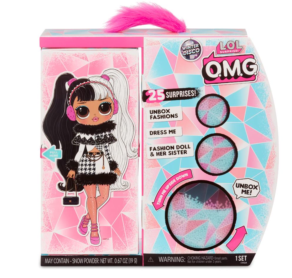 Otwórz ponad 25 niespodzianek! Lalki L.O.L. Surprise OMG z serii Winter Disco z mniejszymi siostrami! Zbierz wszystkie lalki OMG! Karton może służyć jako garderoba i przebieralnia. W zestawie stojak na lalkę i inne akcesoria modowe.