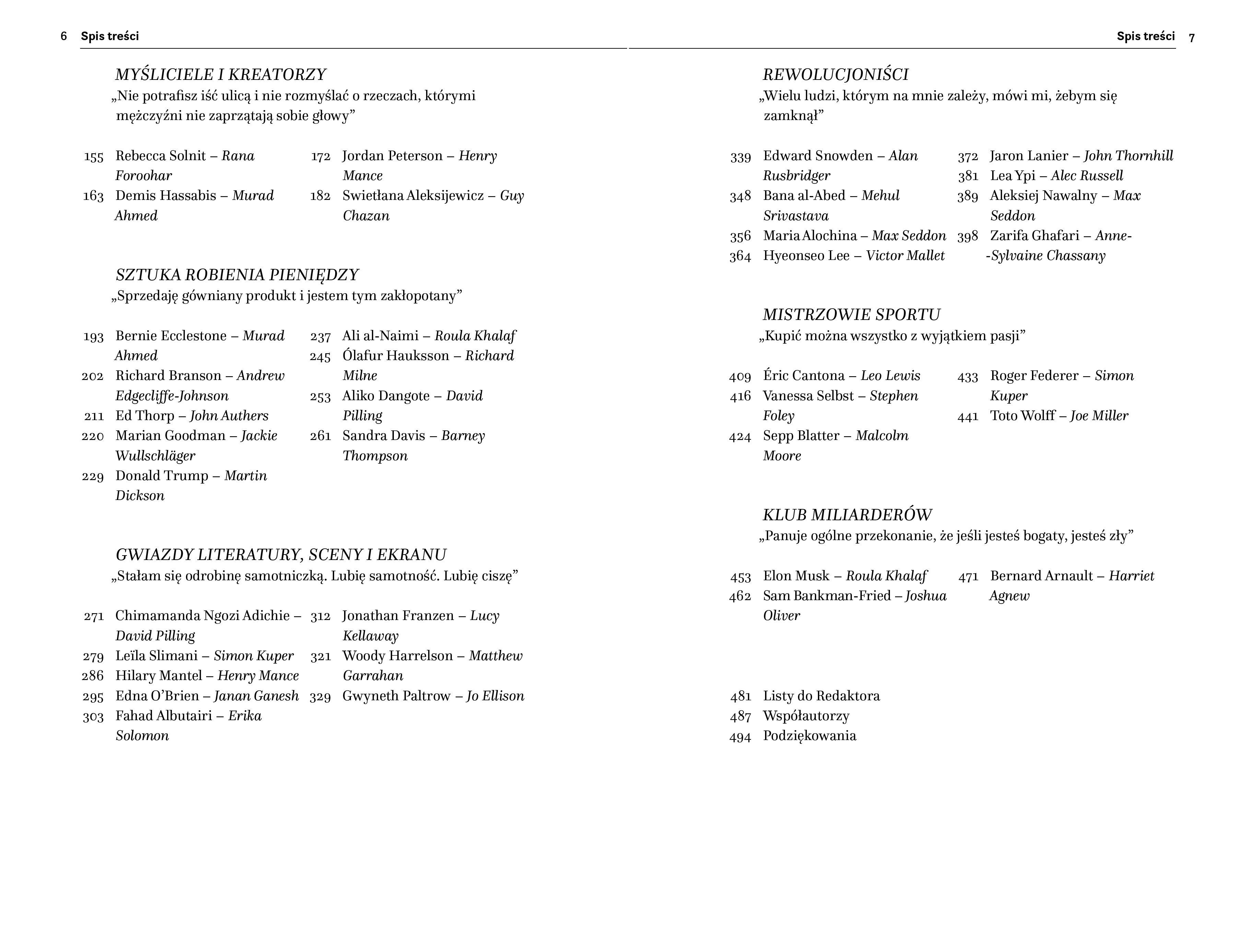 Opis produktuZasady bezpieczeństwaZAPRASZAMY NA NAJSŁYNNIEJSZE LUNCHE ŚWIATA "Financial Times" zaprasza na "Lunch z liderami" - gość wybiera restaurację, a wydawca reguluje rachunek. Rozmówcy rozluźniają się przy jedzeniu i butelce wina i pozwalają sobie na otwartość, autentyczność, a nawet niedyskrecję. Z kim spośród wszystkich ludzi na świecie chciałbyś pójść na lunch? Co tak naprawdę kryje się za prowokacjami Elona Muska na Twitterze? Na co nie mógł sobie pozwolić Bernard Arnault, właściciel 70 luksusowych marek, od Louis Vuittona i Diora po Hennessy'ego i Dom Prignon? Jak Swietłana Aleksijewicz widzi dzisiejszą Rosję? Dlaczego w Google DeepMind nad sztuczną inteligencją pracują filozofowie? Czego nauczyła się od inwestorów aktorka Gwyneth Paltrow? W swojej kultowej rubryce "Financial Times" przez prawie 30 lat publikuje wywiady z wielkimi i najważniejszymi, ludźmi sukcesu, liderami, osobami, które kształtują świat i wpływają na bieg historii. Spotkaj się z największymi osobowościami ze świata biznesu, marketingu, finansów, polityki, sztuki i sportu. Sprawdź, czy twoja opinia na ich temat jest słuszna, poznaj ich najskrytsze tajemnice i dowiedz się, na czym polega sekret ich sukcesu. POZNAJ BLIŻEJ LUDZI, KTÓRZY ZMIENIAJĄ BIEG HISTORII ROZDZIAŁ SPECJALNY! Sprawdź, o czym rozmawiano podczas jedynego w Polsce lunchu z "Financial Times" x