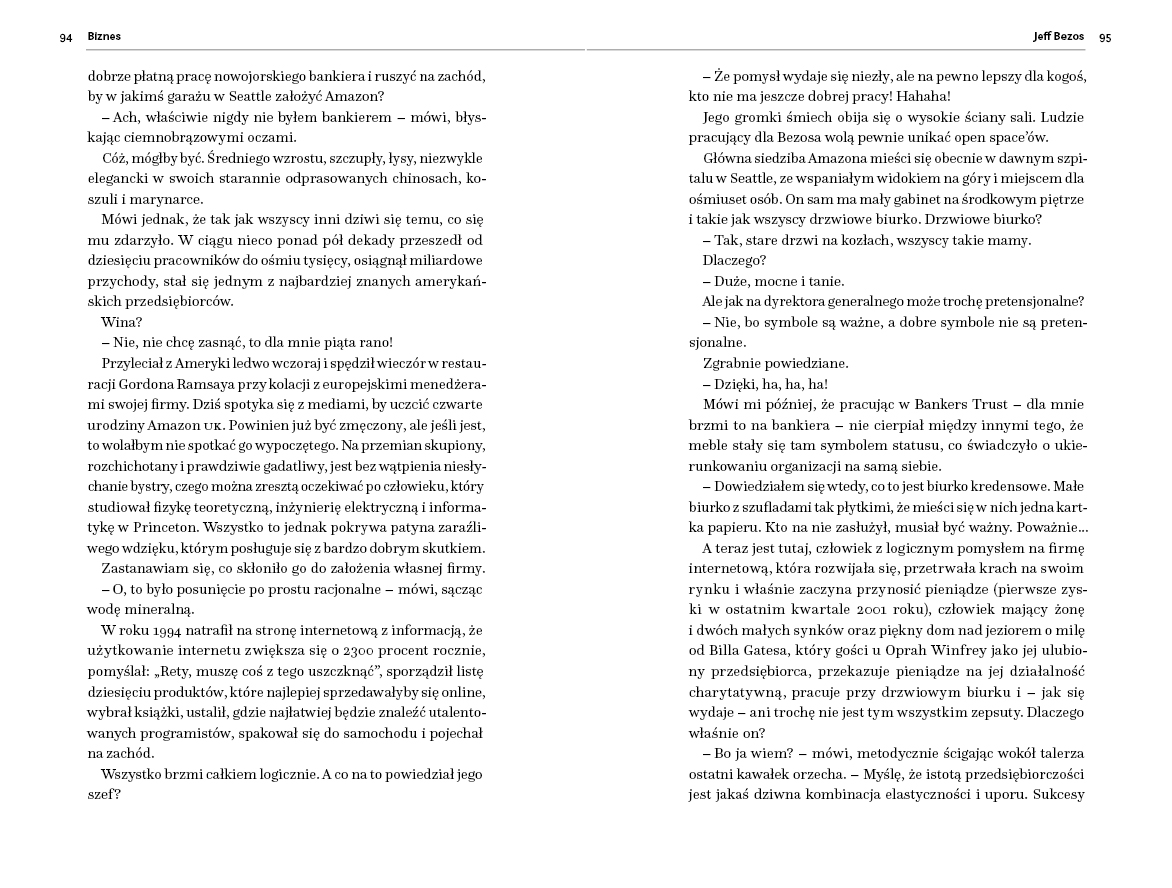 Opis produktuZasady bezpieczeństwaZ kim spośród wszystkich ludzi na świecie najbardziej chciałbyś pójść na lunch? Spotkaj się z największymi osobistościami ze świata sztuki, biznesu, mody, polityki i sportu. To niepowtarzalna okazja, żeby dowiedzieć się, na czym polega tajemnica ich sukcesu. Dlaczego Jeff Bezos pracuje przy zwykłym tanim biurku? Jak wygląda lunch z Michaelem O'Learym w "standardzie Ryanaira"? Jak to możliwe, że szef największego towarzystwa ubezpieczeniowego uprawia jeden z najbardziej ekstremalnych sportów na świecie? Jak George Soros zarobił miliard funtów w ciągu jednego dnia? W jaki sposób prezydent USA Jimmy Carter "trzymał kraj z dala od wojny"? Co wspólnego ma Steve Wozniak z gwiazdą rocka? Dlaczego Dolce i Gabbana nie sprzedają ubrań za gotówkę, a założycielka marki Jimmy Choo osobiście farbuje buty celebrytom? "Financial Times" zaprasza na Lunch z ludźmi sukcesu- gość wybiera restaurację, a wydawca reguluje rachunek. Rozmówcy rozluźniają się przy obiedzie i butelce wina, pozwalając sobie na otwartość, autentyczność, a nawet niedyskrecję. Jakie sekrety zdradzili? Którą restaurację wybrali? Co zamówili? Wszystko jest jawne. Poznaj wielkienazwiska od bardziej osobistej strony i zainspiruj się ich szczerością. PORA NA LUNCH Z LIDERAMI x