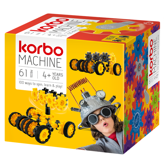 Korbo klocki MACHINE 61 el. Żółto-szare klocki konstrukcyjne pozwalają na zbudowanie fantastycznego pojazdu, wyposażonego w opony na kołach zębatych. Dzięki nim i specjalnym korbkom, mały budowniczy może wprawić swoją konstrukcję w ruch.
