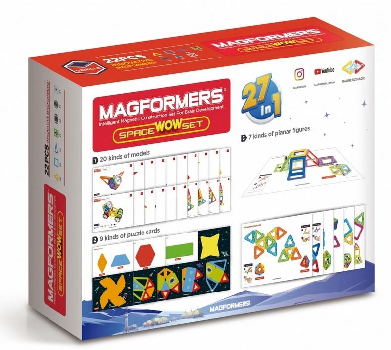 MAGFORMERS VEHICLE SPACE WOW 22 to klocki z wbudowanymi silnymi magnesami neodymowymi, które zawsze się przyciągają. Wystarczy zbliżyć do siebie ściankami dwa klocki, a one natychmiast ze sobą się połączą. Za pomocą klocków wzorowanych na kształt figur geometrycznych można zbudować wspaniałe trójwymiarowe budowle. W zabawie można korzystać z dołączonej do zestawu instrukcji lub innych przykładów zamieszczonych na stronie magformersworld.com lub własnej wyobraźni. W skład zestawu wchodzi: 8 trójkatów; 5 kwadratów; 4 wysokie trójkąty; 3 klocki specjalne; 2 koła.