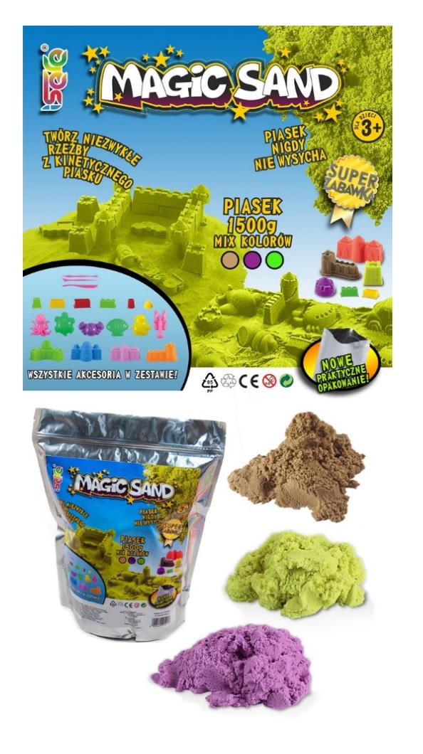 Magiczny Piasek doskonałe relaksuje, wycisza, jest niezwykle przyjemny w dotyku. Jest to materiał plastyczny będący pochodną modeliny. Produkt nie wysycha i nie twardnieje nawet po wielokrotnym użyciu. Piasek jest wysoce lepki, ale jednocześnie nie przykleja się do rąk, ubrań czy innych przedmiotów. Do kształtowania piasku nie potrzeba również wody ani dużo siły, a na koniec zabawy powróci on do swojej oryginalnej postaci.