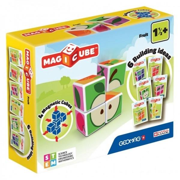 Na jakie owoce masz ochotę? Dzięki klockom magnetycznym Geomag Magicube dzieci uczą się spostrzegawczości. Dołączone do zestawu karty przedstawiają wzory do ułożenia z klocków, najmłodsi z chęcią podejmą próbę odtworzenia obrazków.