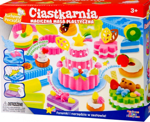 W zestawie znajdują się 4 masy w 3 podstawowych kolorach: żółtym, niebieskim i czerwonym oraz białym, wałeczek i rozmaite, stosowne dla właściwej kuchni foremki do kształtowania mas, a także inne akcesoria przydatne do zabawy określonym zestawem, takie jak formeki do formowania kolejnych pięter tortów i wspaniałych dekoracji. Dodatkowo na pudełku znajdziesz różne talerze do wycięcia oraz rady jak mieszać kolory by powstały nowe, takie jak zielony, pomarańczowy czy fioletowy.