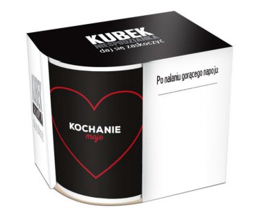 Magiczny kubek z napisem, który zmienia swoją kolorystykę pod wpływem nalania gorącego napoju.