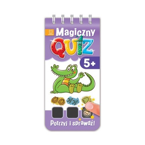 Magiczny quiz to świetna zabawa i sposób sprawdzenia wiedzy dziecka! Aby wskazać odpowiedź, należy przyłożyć palec lub delikatnie potrzeć pokryty farbą termiczną kwadracik – pod wpływem ciepła pojawi się znaczek poprawnej lub błędnej odpowiedzi. W książce zamieszczonych jest 76 pytań obrazkowych wraz z odpowiedziami. Quiz to pomysł na udany prezent i interesującą naukę.