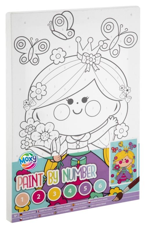 Malowanie po numerach, wzór Księżniczka. Obrazek o wymiarach 30 x 20 cm. Wzór nadrukowany na płótnie,zestawie 6 kolorów farbek i pędzelek.
