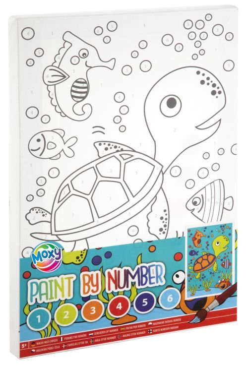 Malowanie po numerach, wzór Żółwik. Obrazek o wymiarach 30 x 20 cm. Wzór nadrukowany na płótnie, zestawie 6 kolorów farbek i pędzelek.