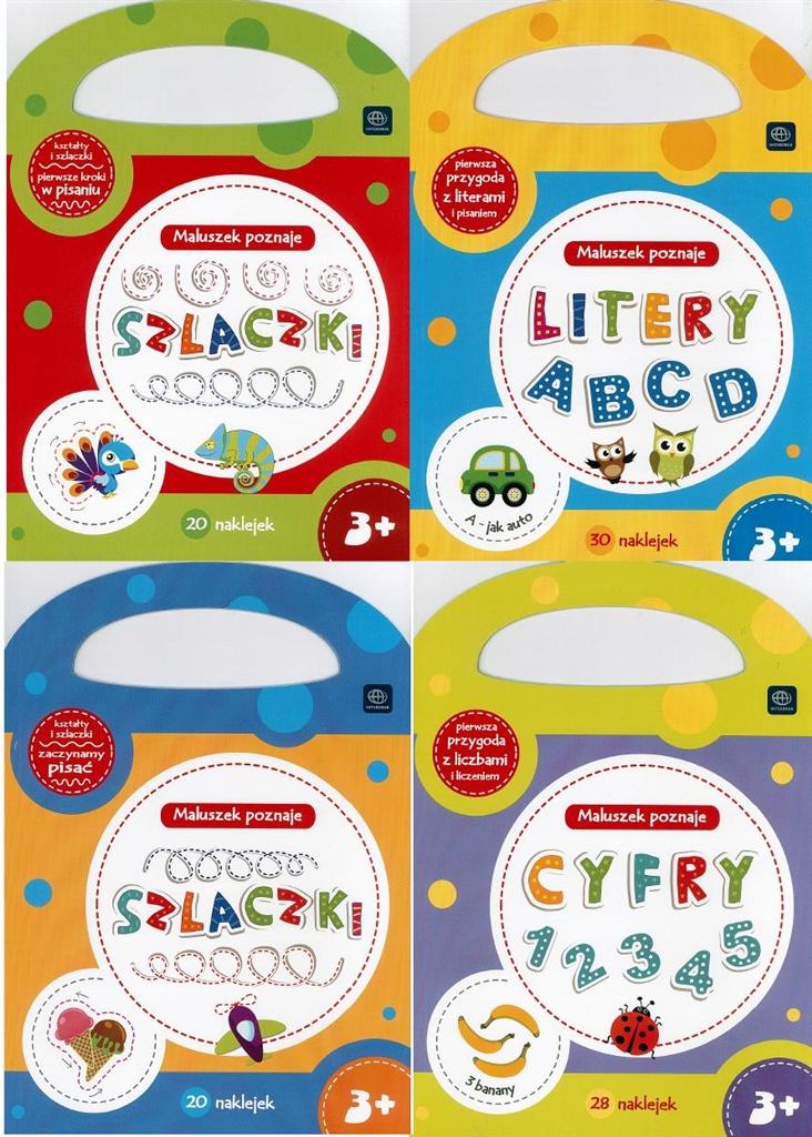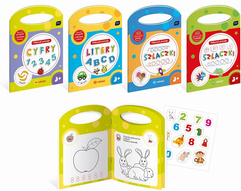 Kolorowanki z naklejkami Maluszek poznaje. W serii: Cyfry, Litery, Szlaczki.