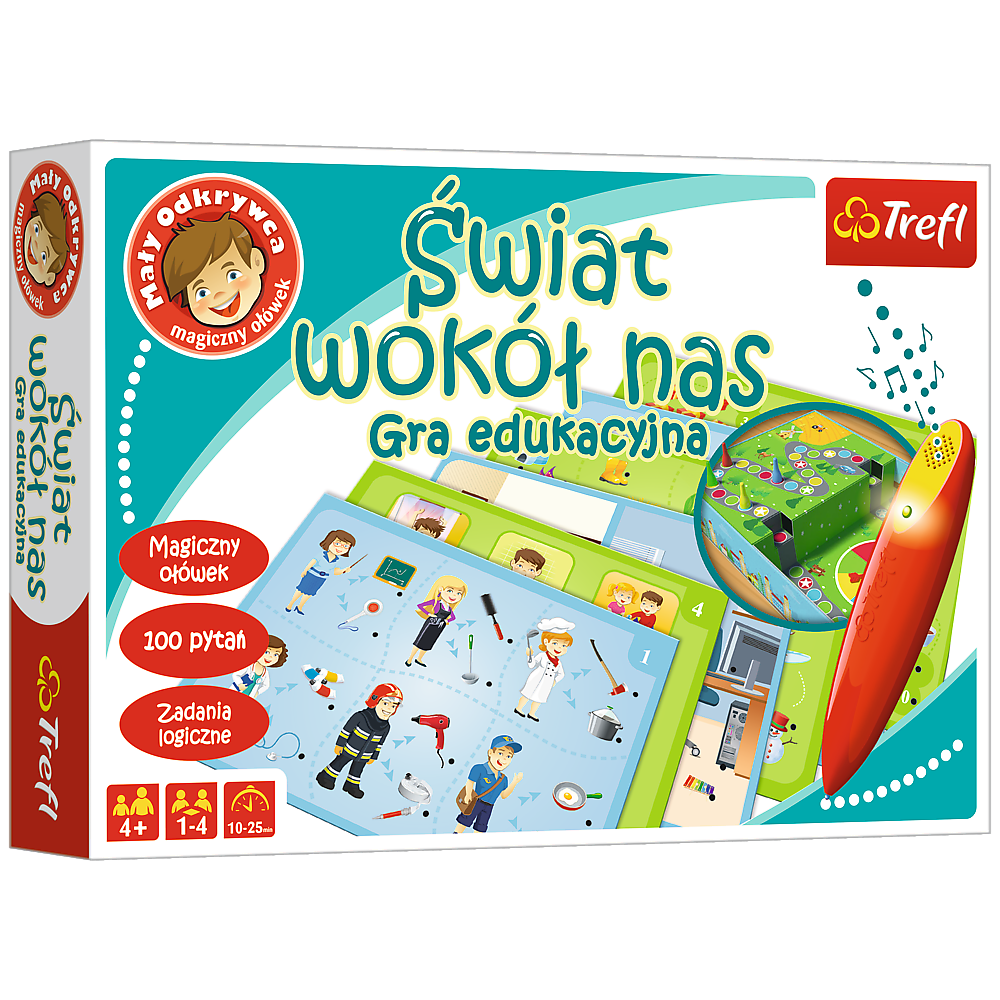 Świat wokół nas jest naprawdę fascynujący. Zapraszamy Małych Odkrywców na wyprawę! Gra rozbudzi w dzieciach ciekawość poznawczą i zachęci do eksplorowania najbliższego otoczenia. Czy wiesz, czym różnią się pory roku? Czy znasz różne zawody i akcesoria potrzebne ludziom w pracy? Umiesz rozpoznać pojazdy? Czy potrafisz wybrać odpowiednie ubranie na każdą pogodę?
