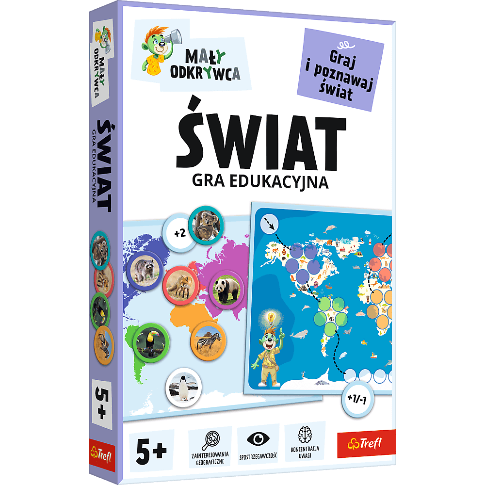 Świat to edukacyjna gra dla przedszkolaków, która w przyjazny sposób wprowadza dzieci w świat zwierząt. Poprzez zabawę maluchy uczą się zabytków i charakterystycznych elementów każdego z kontynentów. Gra rozwija pamięć, pobudza wyobraźnię oraz wzbogaca słownictwo, wspierając naukę czytania.