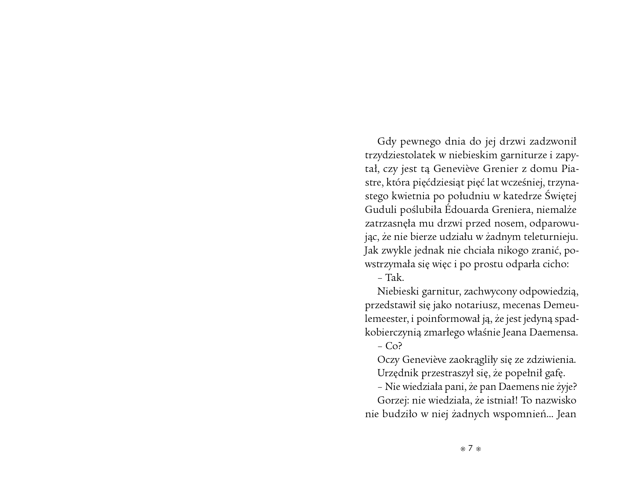 Opis produktuZasady bezpieczeństwaCZY MOŻNA ZNALEŹĆ NOWĄ MIŁOŚĆ, GDY WCIĄŻ ŻYJE SIĘ W CIENIU POPRZEDNIEJ? Była zrozpaczona, gdy opuścił ją tak nagle. Pozostawiona sama sobie, bezbronna. Nowy mężczyzna miał pomóc zapomnieć o przeszłości i otworzyć nowy rozdział. Ale jedna myśl nie dawała jej spokoju: kim tak naprawdę był jej poprzedni mąż? Czy kiedyś będzie mogła się od niego uwolnić? W Małżeństwie we troje Schmitt z właściwą sobie wnikliwością i finezją opowiada historie niewidzialnych miłości - tych, których nie wyznajemy ani sobie, ani bliskim, tych, które są w nas przecież tak intensywnie obecne, ale pozostają umiejscowione na granicy świadomości. ric-Emmanuel Schmitt to najchętniej czytany w Polsce francuski pisarz, autor m.in. bestsellerowego Oskara i pani Róży oraz zachwycającej swym rozmachem serii Podróż przez czas (dotychczas ukazały się dwa pierwsze tomy, Raje utracone i Brama do nieba). Jego książki, przetłumaczone na 35 języków, zdobyły wiele nagród na całym świecie. x