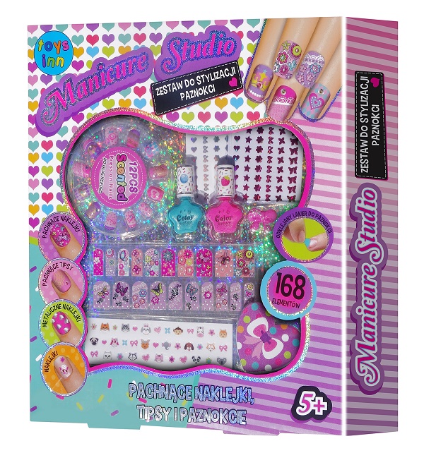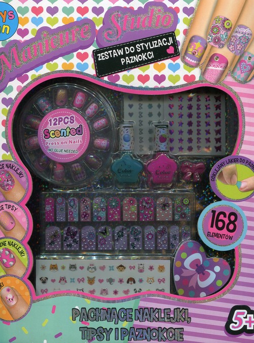2 pachnące lakiery do paznokci, pierścionek, 20 pachnących naklejek do paznokci, 12 pachnących tipsów, 3 arkusze naklejek metalicznych