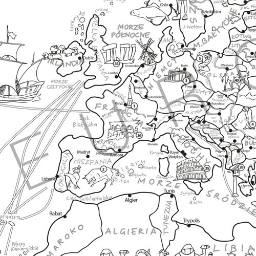 Kolorowanka XXL z mapą Świata Młodego Odkrywcy. Dzięki zawartości merytorycznej obrazka może pełnić rolę edukacyjną a zarazem być świetną rozrywką oraz sposobem na niecodzienne spędzanie czasu. Na mapie zaznaczono kontynenty wraz z ukształtowaniem terenu, jak też za pomocą piktogramów najbardziej charakterystyczne budowle, zwierzęta, pomniki przyrody, wydarzenia. Dzięki temu mapa jest fascynującym źródłem wiedzy o historii i teraźniejszości naszego świata. Przekazuje w ciekawy sposób informacje z zakresu geografii, przyrody i kultury. Pobudza wyobraźnię, zachęca do zdobywania wiedzy i inspiruje. Jest również świetnym pretekstem do spędzania w twórczy sposób wspólnego czasu rodziców z dziećmi.