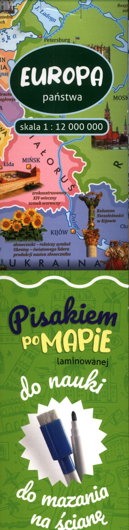 Plakat z mapą EUROPA - PAŃSTWA z serii Pisakiem po mapie rozbudzi w dziecku ciekawość świata i zachęci do planowania podróży. To świetna pomoc w opanowaniu nazw państw europejskich i ich stolic, zapamiętaniu relacji wielkości i położenia danego kraju względem innych państw oraz w odniesieniu do mórz i oceanów. Mapa zawiera też obrazki przedstawiające charakterystyczne dla danego państwa zabytki i atrakcje turystyczne. Zawiera także flagi wszystkich państw europejskich a także liczbę ich mieszkańców. Kolejnym atutem plakatu jest wydrukowana po drugiej stronie ,,pusta"", tj. pozbawiona nazewnictwa geograficznego i opisów, mapa. Dzięki zafoliowaniu całego plakatu można po niej wielokrotnie pisać i ścierać zrobione opisy. To możliwość sprawdzenia co zostało w pamięci po studiowaniu pierwszej strony plakatu - gdzie leżą poszczególne państwa i jak nazywają się ich stolice. Można też zrobić mapę własnych, już odwiedzonych lub planowanych do zwiedzenia turystycznych atrakcji europejskich.