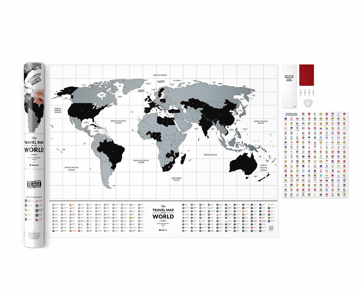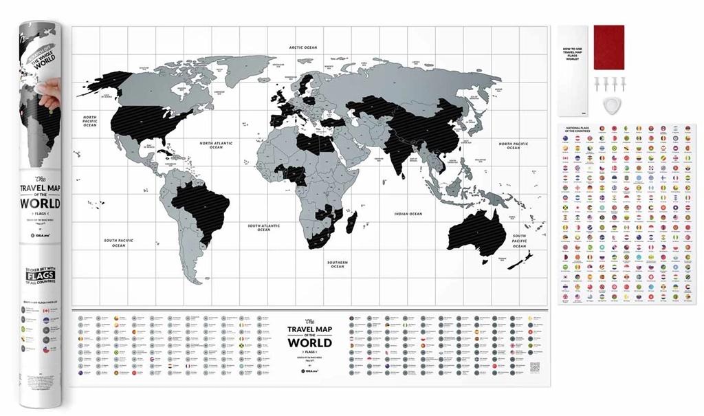 Opis produktuZasady bezpieczeństwaTravel Map™ Flags World to wyjątkowa, biało-czarna mapa świata wraz z listą krajów opatrzoną flagami pokryta srebrną powłoką do zdrapywania. Minimalistyczny design będzie idealnie komponował się z surowymi, nowoczesnymi wnętrzami. To prawdziwy kąsek dla ludzi ceniących minimalizm i wysoką jakość wykonania. Czarna mapa świata umieszczona jest na białym tle. Wystarczy za pomocą dołączonej do zestawu kostki usunąć srebrną powłokę z danego kraju, aby stworzyć całą historię swoich podróży. Dodatkowo w zestawie znajdziesz zestaw naklejek z flagami narodowymi, dzięki którym możesz zaplanować kolejne destynacje. Rozmiar mapy: 80 x 60 cm; Rozmiar opakowania (tuba): 64 x 7 cm Mapa jest zrobiona z wysokiej jakości laminowanego papieru Darmowa dostawa w ciągu 3 dni od zamówienia. x