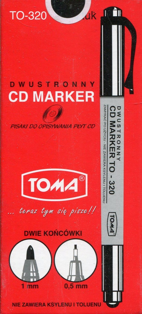 Pisak permanentny z tuszem wodoodpornym, idealny do opisywania płyt CD. Do pisania po wszystkich powierzchniach. Posiada dwie końcówki: - 0,8 mm fibrowa, stożkowa,- 0,5 mm metalowa, igłowa. Dostępne kolory: czarny, niebieski, czerwony.