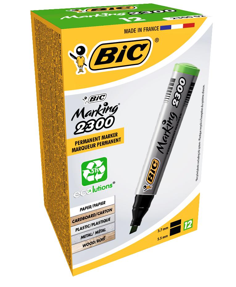 Marker Ekologiczny obudowa wykonana w 51% z materiałów przetworzonych. Marker z tuszem na bazie alkoholu, bezzapachowy. Polipropylenowa obudowa o średnicy 20mm i długości 13,8cm zawiera 5.4 g atramentu. Bez skuwki, nie wysycha przez 3 tygodnie. Zablokowana końcówka nie ugina się i nie cofa pod naciskiem. Długść linii pisania dla końcówki okrągłej 1400m, dla ściętej 1100 m. W opakowaniu zbiorczym znajduje się 12 sztuk. x