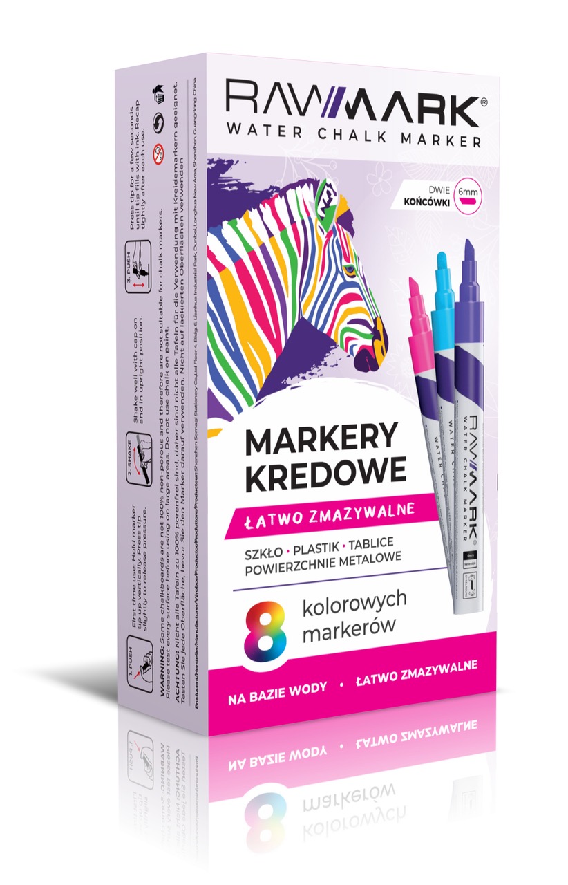 Opis produktuZasady bezpieczeństwaKREDOWE MARKERY do tablic / szkła Ilość: 8 kolorów Marka: RAWMARK Dwustronna końcówka Ekologiczny tusz na bazie wody Markery pomagają rozwijać wyobraźnię! Nie musisz chodzić i pilnować młodych rozrabiaków, ponieważ kiedy popiszą po lustrze, czy szybie - po prostu zetrzesz tusz wilgotną ściereczką. Stwórz dekorację Niezapomniane wrażenia możesz dostarczyć każdemu z kręgu twoich znajomych. Dzięki tym markerom możesz na lustrze w łazience napisać "Pamiętaj, że Cię kocham!" - dzięki temu sprawisz, że się uśmiechnie. W łazience, w kuchni, na oknie, na tablicy - tylko TY dyktujesz granicę.. Jeżeli stworzysz grafiki w oknach lub lustrach - możesz zrobić sobie, rodzinie, lub przechodniom "DZIEŃ DOBRY !!!" Zmazywalny z powierzchni nieporowatych: - tablice kredowe (czarne, zielone etc.) - tablice suchościeralne (whiteboard) - tablice szklane - szkło (także lustra) - plastik (również folia) - metal - winyl (także PVC) Trudno zmazywalny na powierzchniach porowatych: - karton - papier - drewno Markery kredowe w 8 najbardziej potrzebnych kolorach: - CZERWONY - BIAŁY - POMARAŃCZOWY - ŻÓŁTY - ZIELONY - FIOLETOWY - NIEBIESKI - RÓŻOWY UWAGA! Markery posiadają dodatkowe zabezpieczenie, przez co przed pierwszym użyciem musisz potrząsnąć i przycisnąć do kartki końcówkę. Dzięki temu tusz spłynie, a Ty możesz cieszyć się nowym RAWMARKIEM. x