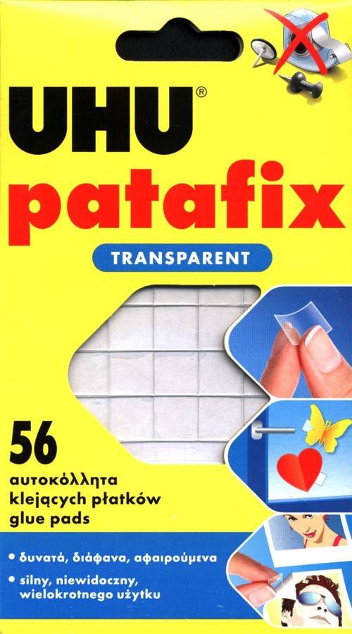 Uhu patafix Invisible to przezroczysty dwustronny płatek do szybkiego i czystego przyklejania małych elementów, takich jak: zdjęcia, pocztówki, rysunki i plakaty do różnych powierzchni: drzwi, okna, meble.