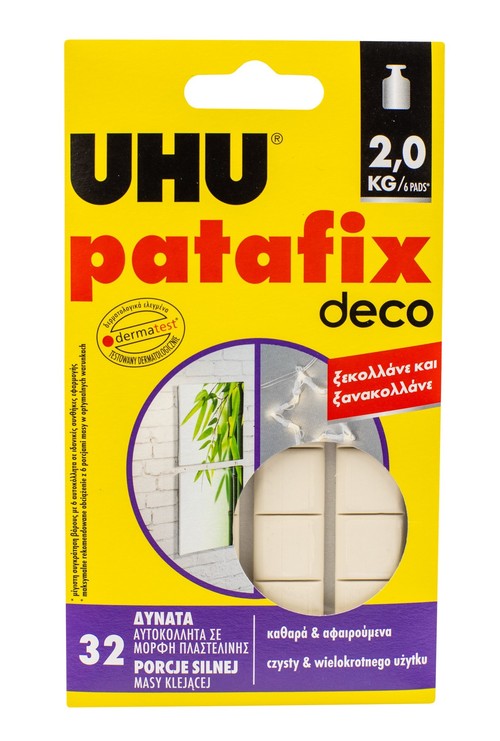 Opis produktuZasady bezpieczeństwaMasa klejąca UHU Patafix Deco 32 porcje w kolorze białym. Przeznaczona do mocowania ozdób i akcesoriów każdego rodzaju o wadze do 3 kg na różnych powierzchniach. Plastyczna masa wypełnia puste przestrzenie, a tym samym idealnie dopasowuje się do nierównych powierzchni. Maksymalne obciążenie 3 kg uzyskuje się w optymalnych warunkach, tj. płaskie przedmioty (głębokość <1 cm) na gładkich i twardych powierzchniach, przy użyciu co najmniej 6 porcji w temperaturze pokojowej (patrz instrukcje dla użytkownika). Nieodpowiednia do delikatnych powierzchni i materiałów. Nie używać na ostatnio malowanych powierzchniach i tapetach. Testowana dermatologicznie. Klejone powierzchnie muszą być suche, bez kurzu i odtłuszczone. Wyprodukowana w Niemczech. x
