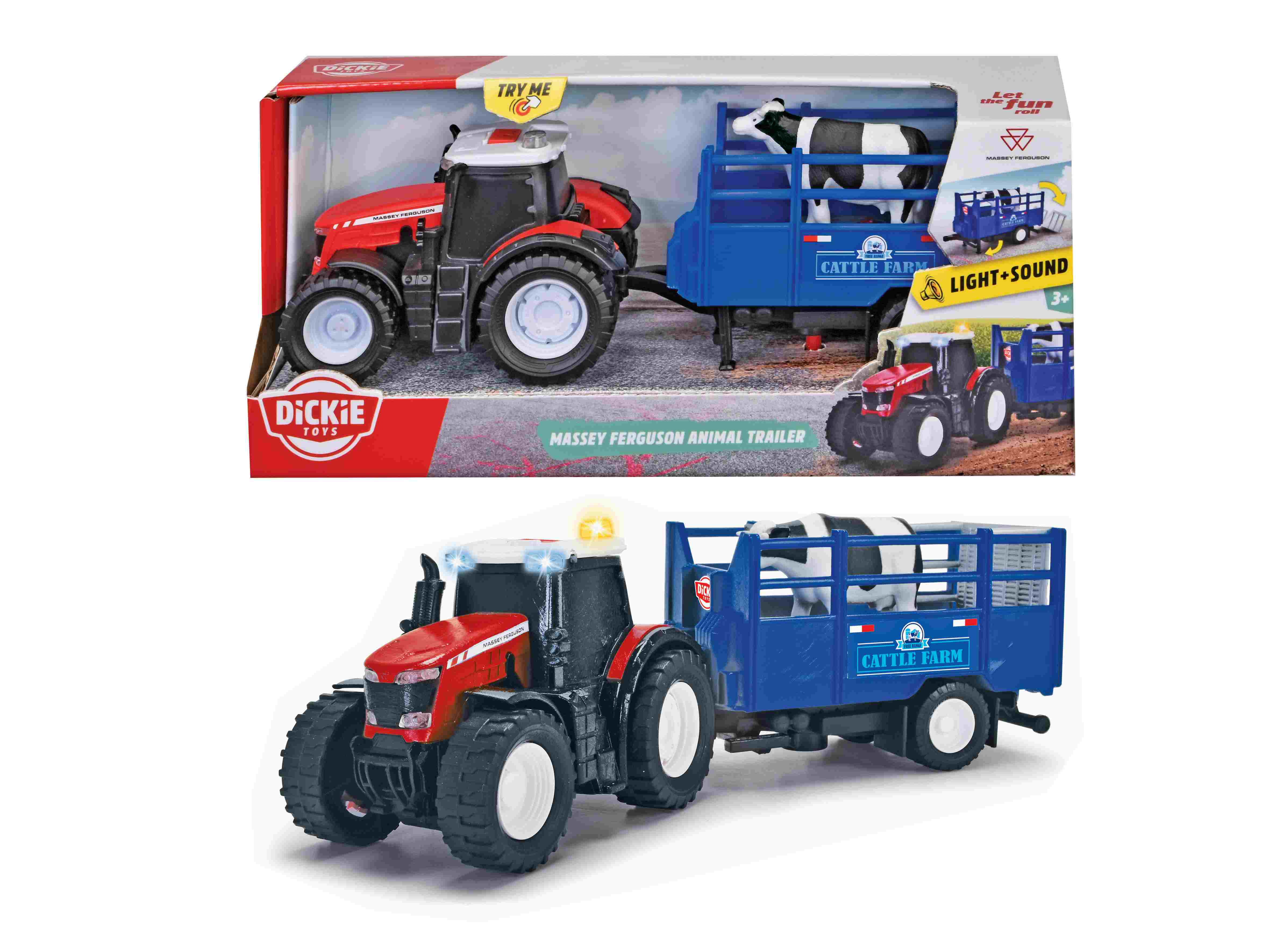 Opis produktuZasady bezpieczeństwaTraktor na licencji Massey Ferguson z funkcją światłą i dźwięku. W zestawie znajduje się odczepiana przyczepka do transportu zwierząt z figurką krówki. Długość 26 cm.