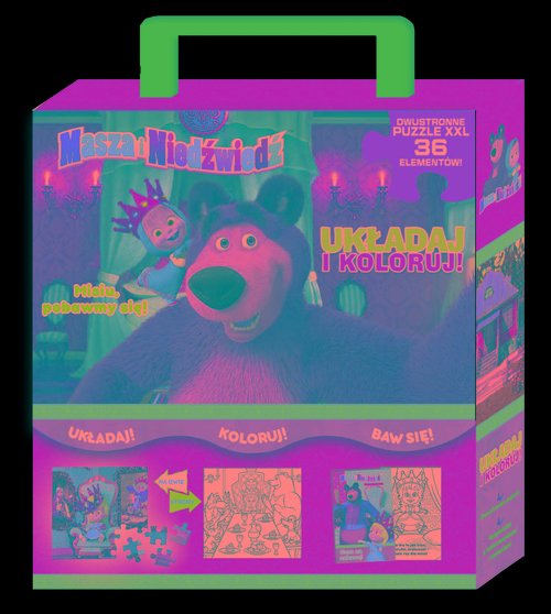 Oto pudełko pełne zabawy! Wewnątrz znajdziesz książeczkę z malowankami oraz dwustronne puzzle. Ułóż obrazek z Maszą i Niedźwiedziem, a potem odwróć układankę i pokoloruj scenkę według własnego pomysłu. x