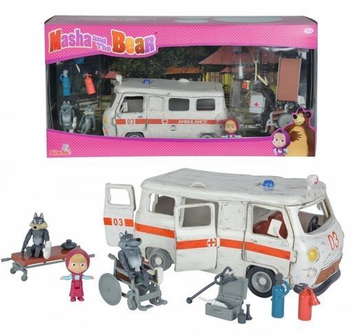 Zestaw z filmu Masza i Niedźwiedź zawiera figurkę Maszy, wilka, ambulans oraz akcesoria.